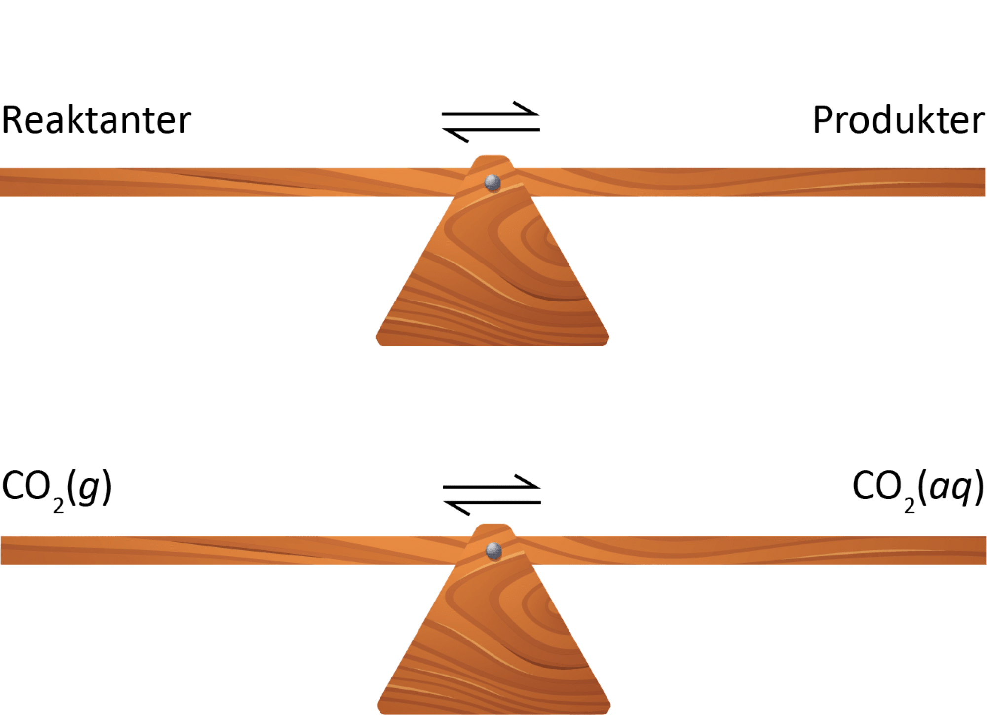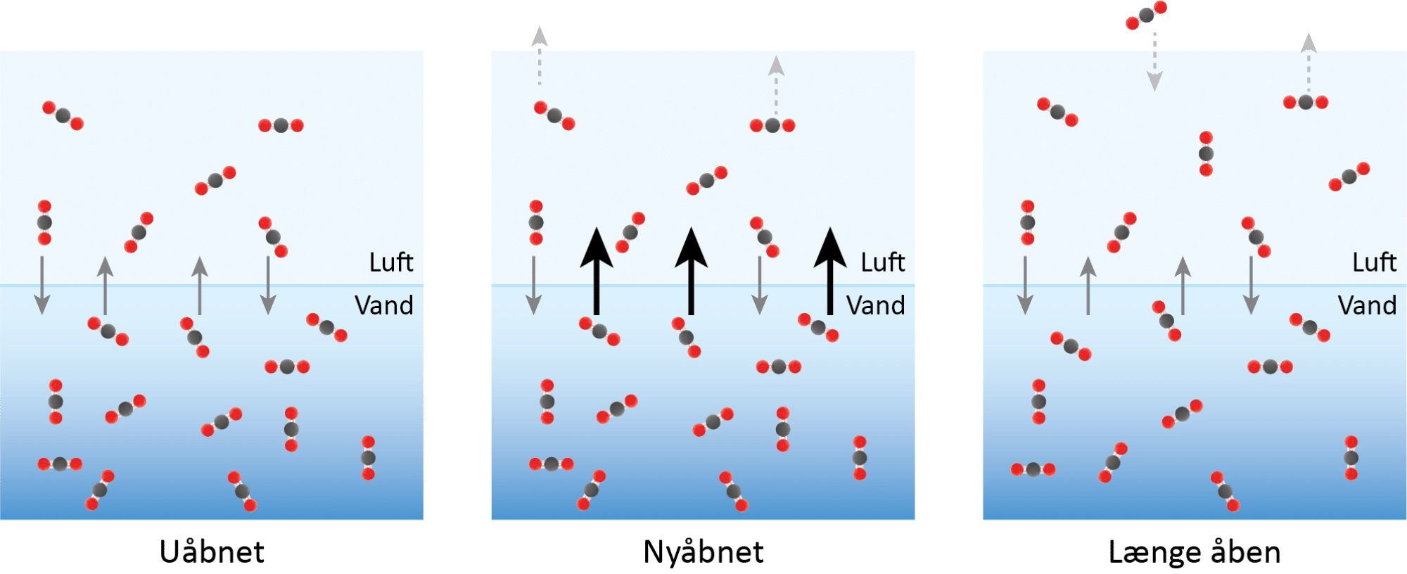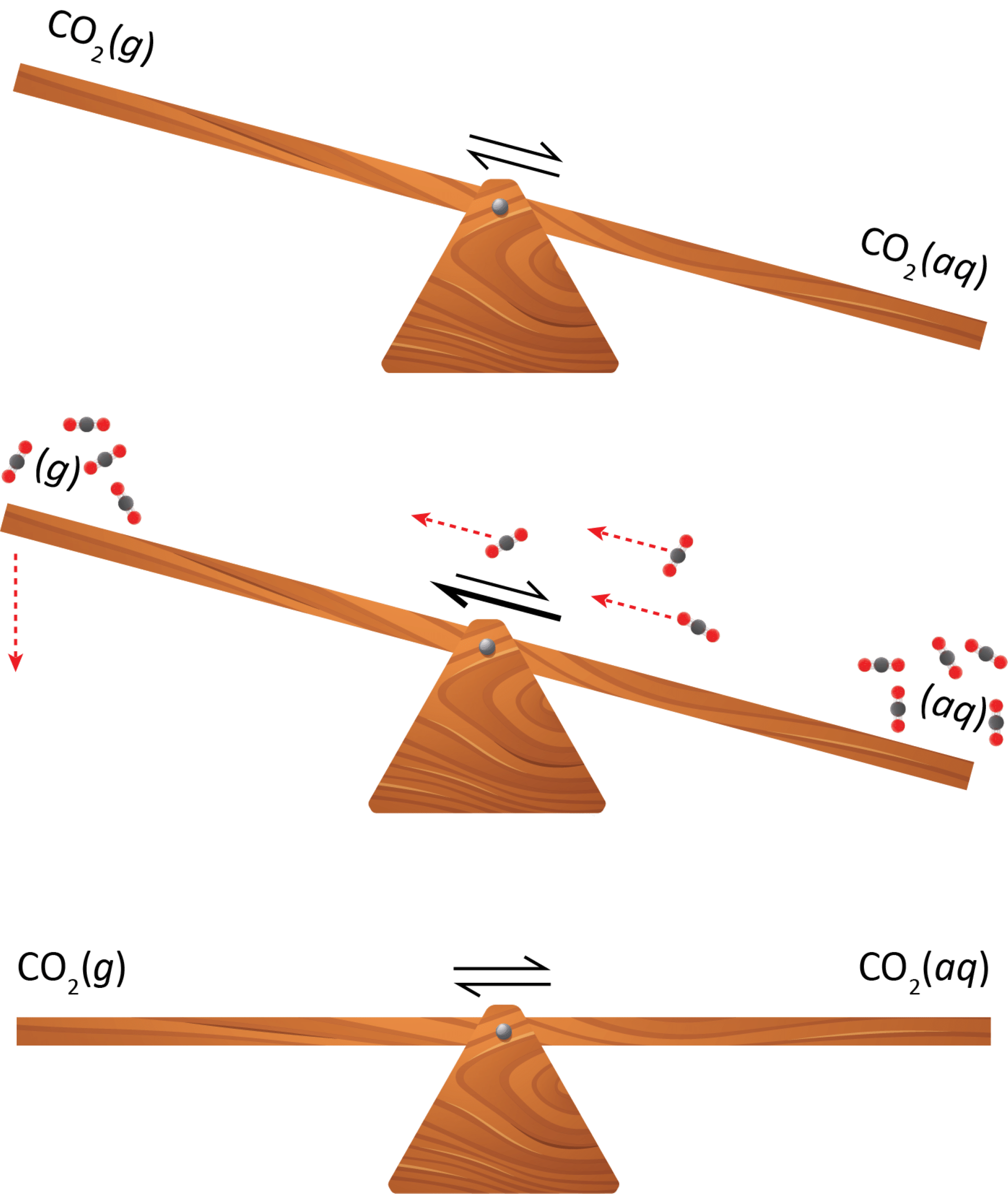 Øverst i figur 10 er vippen lettere på venstre side, hvilket svarer til, at der er forsvundet carbondioxid ud af flasken, da den blev åbnet. Det er lidt som på en vippe på en legeplads, hvor der er hoppet en person af på venstre side. Da kemiske ligevægte altid indstiller sig igen efter et indgreb, skal der flyttes ’noget’ fra højre til venstre side. Det er illustreret på den midterste vippe. CO₂-molekyler, der er opløst i vand (højre side), bliver til CO₂-molekyler på gasform. De stiplede røde pile viser bevægelsen af molekyler op af vandet mod luften. Ligevægtsharpunen er også kraftigere fra højre mod venstre, hvilket betyder, at selvom CO₂-molekyler stadig bevæger sig fra gas til væske, er der flere, der bevæger sig den anden vej, indtil ligevægten igen har indstillet sig som vist på den nederste del af figur 10.
