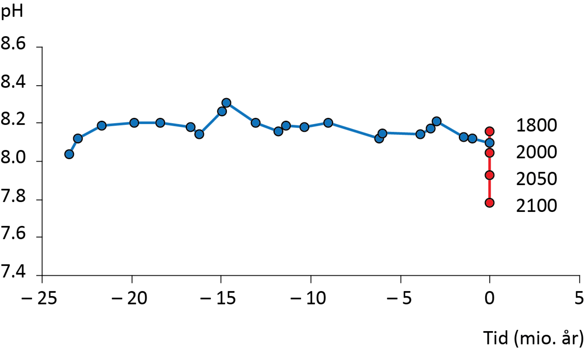 Når koncentrationen af CO₂ i atmosfæren stiger, opløses mere CO₂ i havets overfladevand. Det handler ganske enkelt om, at koncentrationen af reaktanten i ligevægt (7) øges, og dermed forskydes den mod højre, og der opløses mere carbondioxid i havvandet. Men da ligevægt (7) er koblet med ligevægt (8)-(10), dannes der dermed også oxonium, der påvirker pH i havet (se figur 16). Og dette kan som nævnt påvirke de levende organismer i havet.