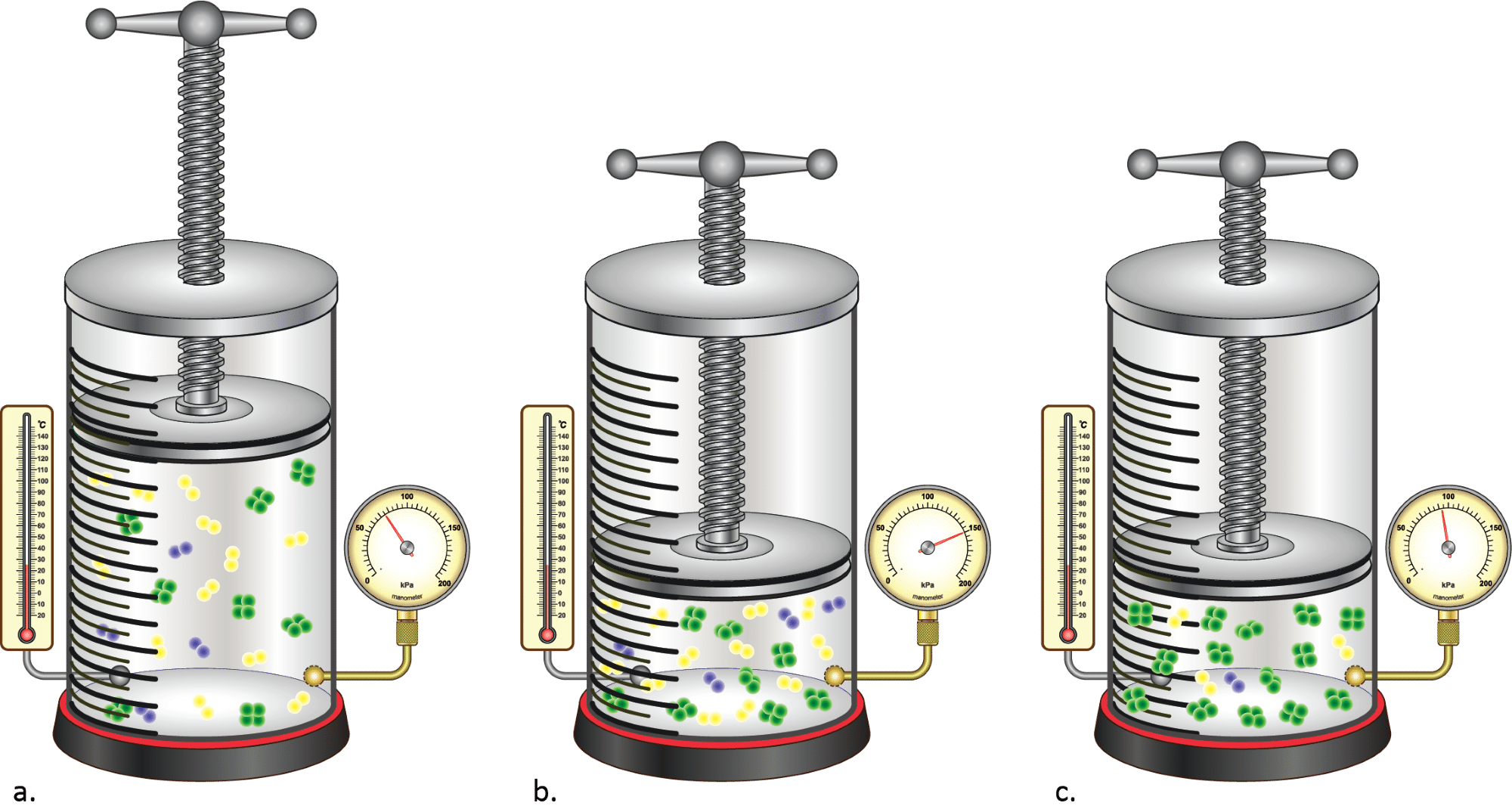 I flasken i demonstrationsforsøg 2 er trykket inden i flasken og udenfor flasken det samme, indtil der tilsættes natriumhydroxid. Herefter lukkes flasken, og carbondioxid går fra gasform til at være opløst i vand. Dette betyder, at trykket inde i flasken falder (se evt. figur 12c). Da der er højere tryk udenfor flasken end inden i, presser omgivelserne på flasken for at trykudligne. Flasken mases derfor sammen, hvorved volumen falder.