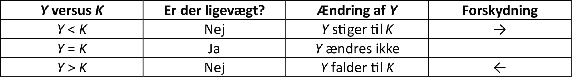 Ligevægt (12) har derfor endnu ikke indstillet sig. Y skal blive større for at have samme værdi som K, og dermed skal ligevægten forskydes mod højre, så tælleren bliver større og nævneren bliver mindre.