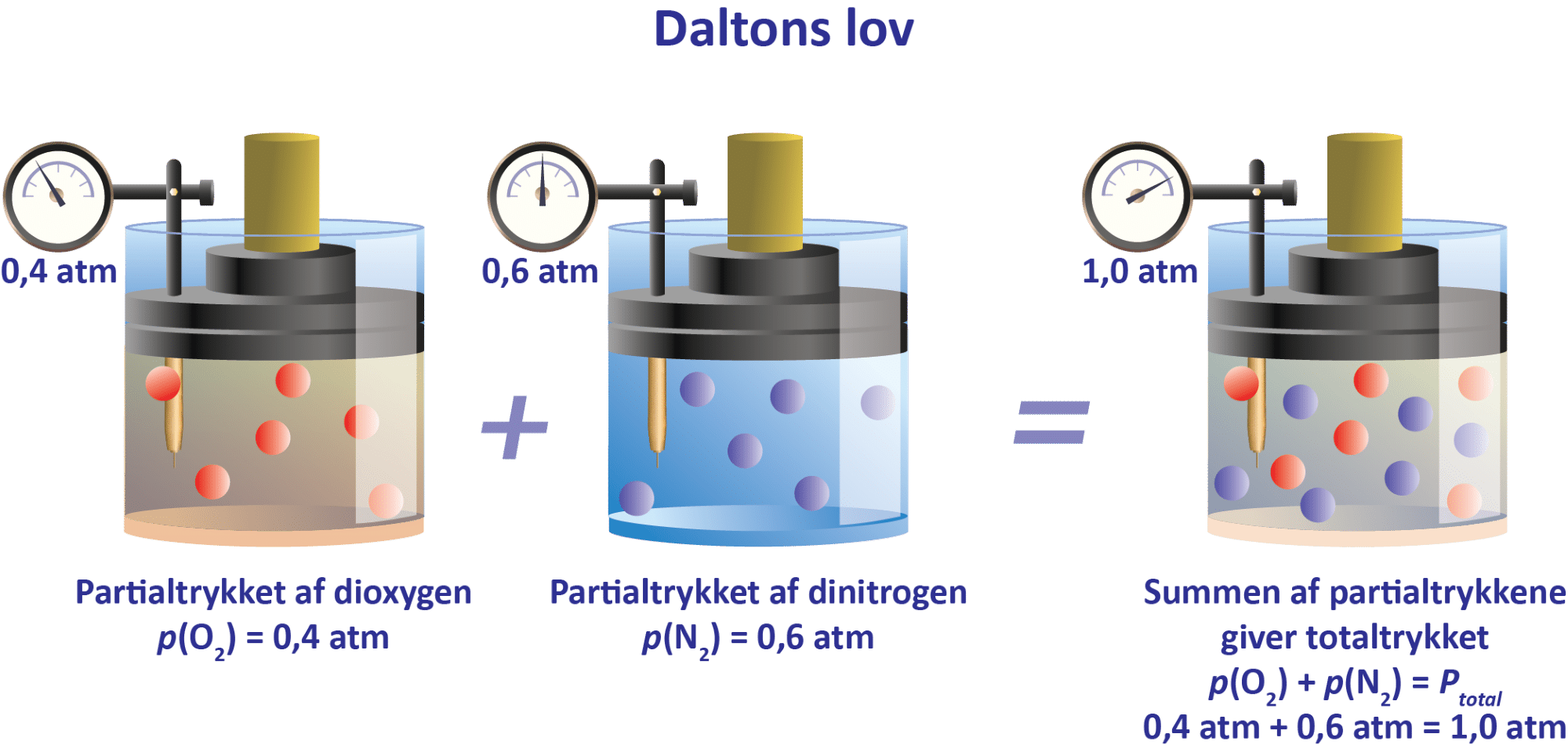 Hvis en ligevægt er en ren gasligevægt, er det ikke den aktuelle koncentration af stofferne, der indgår i reaktionsbrøken, men derimod partialtrykket. Partialtrykket af en gas i en gasblanding er det tryk, gassen ville udøve, hvis den alene fyldte hele beholderen ved samme temperatur. Ifølge Daltons lov er det samlede tryk i en gasblanding summen af alle gassernes partialtryk, som du kan se i figur 14.