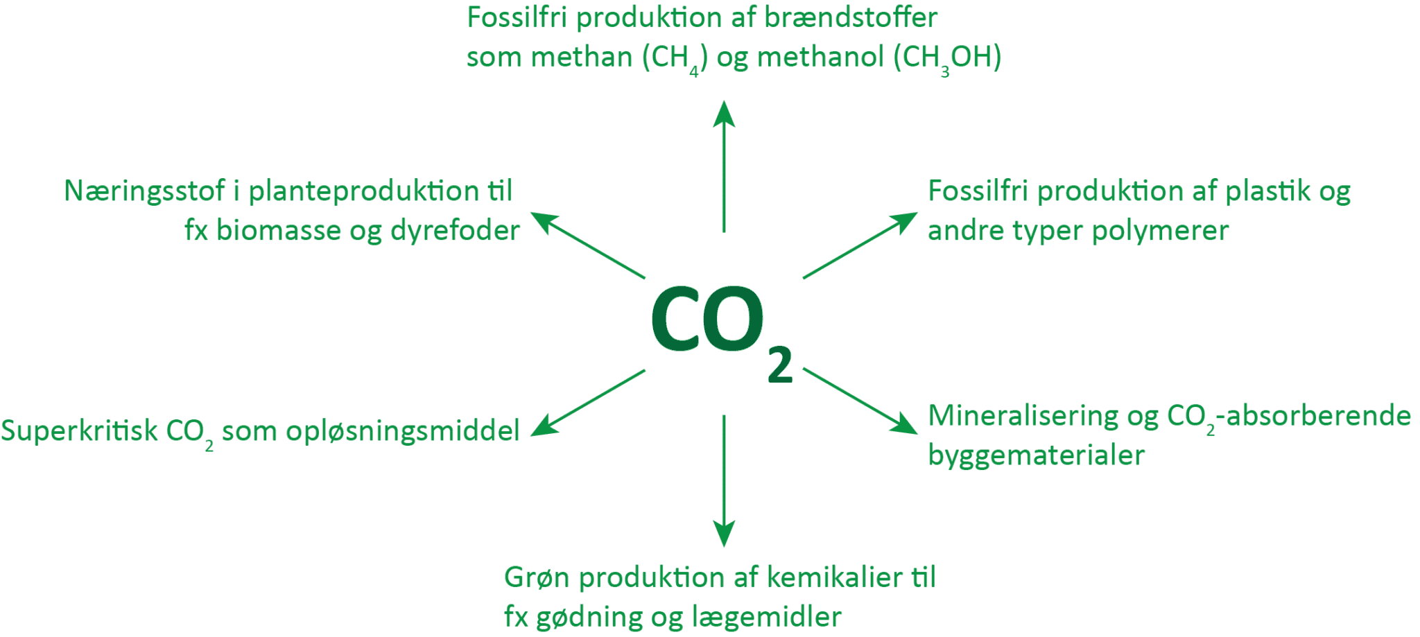 Når du hører om carbondioxid, tænker du måske mest på klimaproblemer og drivhuseffekt. Det er naturligt nok, da det er den fortælling, du mest vil møde i nyhederne. Men carbondioxid kan bruges som en slags ’lego-klods’ i kemiens verden, som du kan se i figur 18 og læse mere om nedenfor. Og netop den kemiske viden om carbondioxids ligevægte, som du har arbejdet med i dette tema, er helt central, når man skal finde nye måder at fange, lagre og omdanne gassen på.
