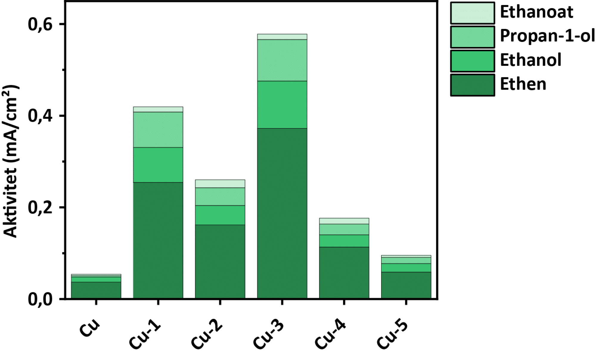 Figur 48. Grafen viser aktiviteten af kobberkatalysatoren med forskellige organiske hjælpemolekyler (Cu-1 til Cu-5). Cu er kontrolprøven. Aktiviteten siger noget om, hvor effektiv katalysatoren er. De forskellige grønne farver viser, hvilke produkter der dannes. Kontrolprøven er en ren kobberkatalysator, der ikke har nogen organiske hjælpemolekyler sat på.