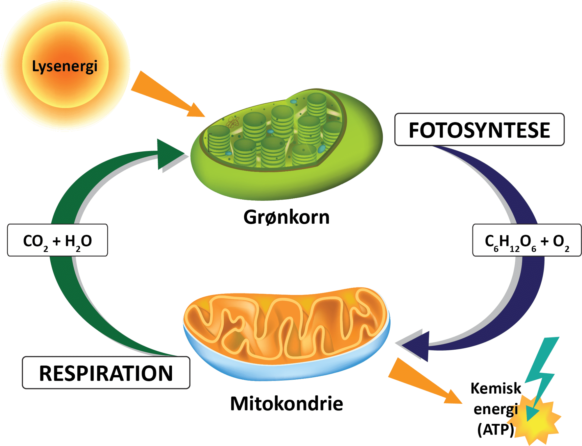 I figur 5 kan du se sammenhængen mellem fotosyntesen og respirationen, og du kan læse mere om disse processer i ’Fremtidens batterier – B-niveau’.