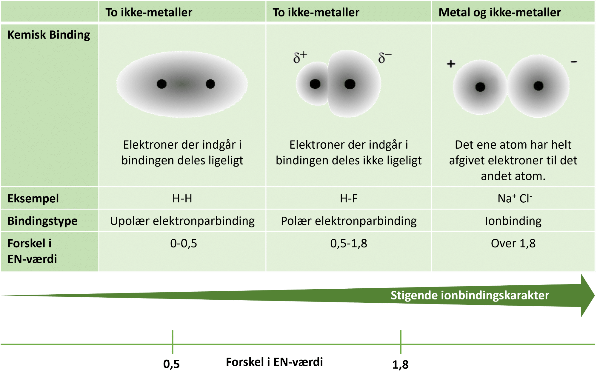Figur 4: Elektronskyen vist i gråtoner rundt om to atomer ser forskellig ud for de forskellige bindingstyper. Det lille græske bogstav, delta (δ), viser, at en elektron er lidt forskudt mod det ene atom, dvs. en delvis ladningsforskydning, og dermed bliver bindingen polær. Derudover er vist eksempler på stoffer, der har de tre forskellige bindingstyper. EN-intervallerne er opstillet for lettere at afgøre bindingstyperne. Nederst illustrerer pilen, at der faktisk er tale om en glidende overgang mellem bindingstyperne fra upolær over polær elektronparbinding til ionbinding.