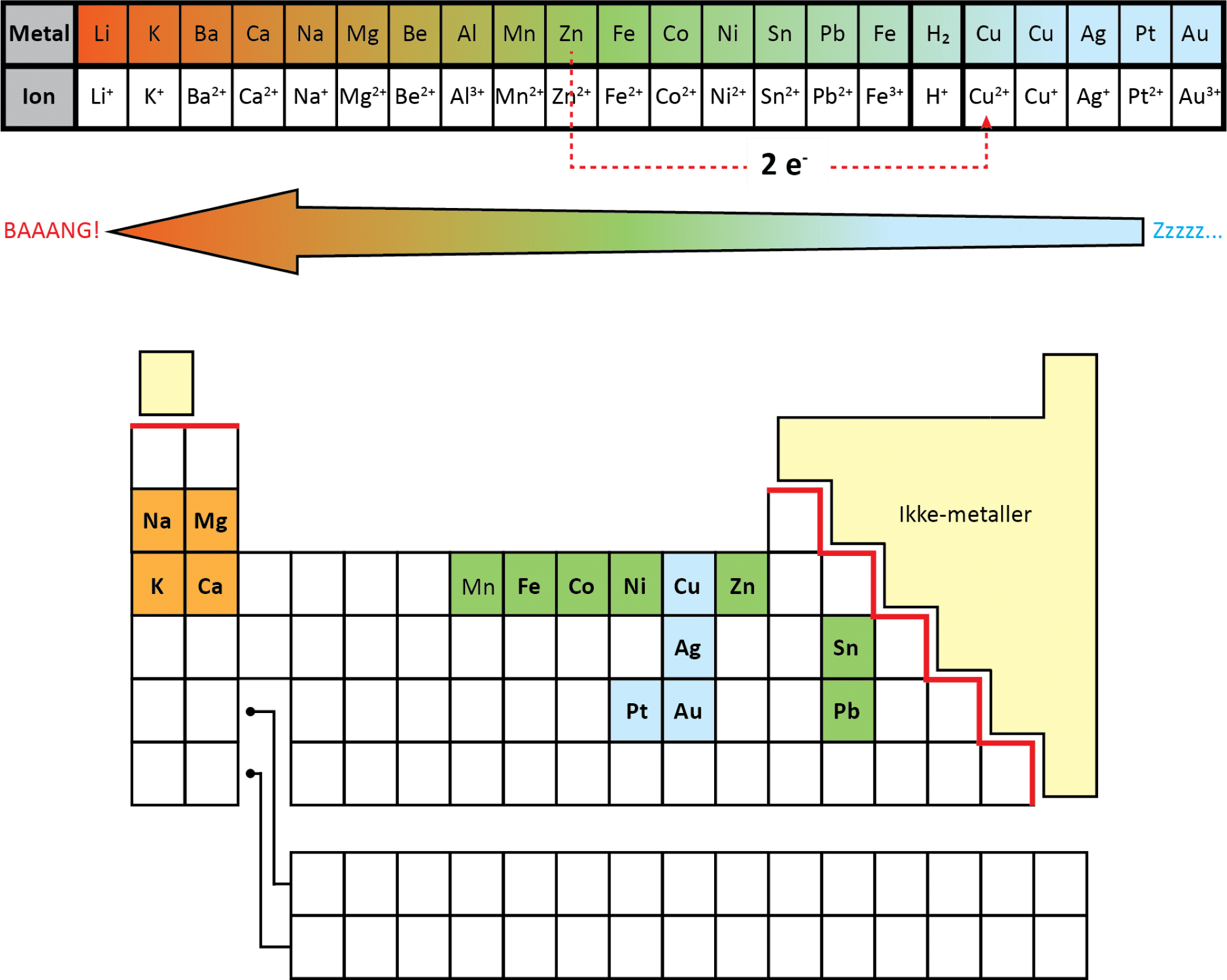 I spændingsrækken står f.eks. magnesium længere til venstre end zink. Det betyder, at magnesium er mere tilbøjelig til at afgive elektroner end zink, og magnesium kan derfor lettere oxideres end zink. Dvs. følgende redoxreaktion kan derfor godt forløbe.