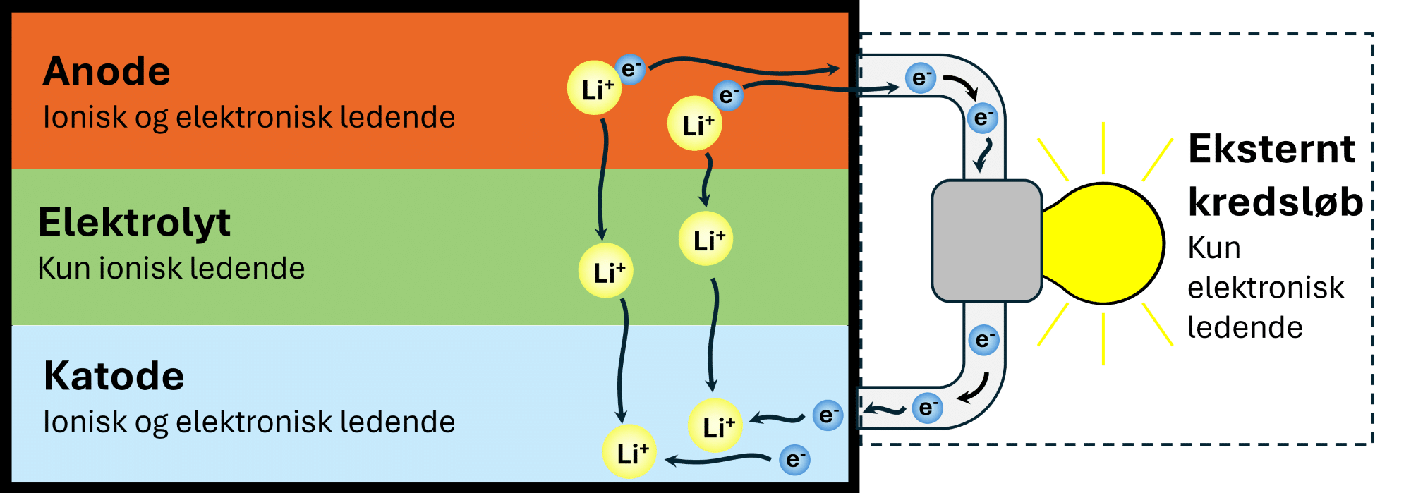 Når batterier er tilsluttet et eksternt, elektrisk kredsløb, sker der en bevægelse af elektroner i kredsløbet. Samtidig sker der faktisk også en tilsvarende bevægelse af ioner inden i et batteri. Materialer, hvor ioner kan bevæge sig igennem, kaldes ionisk ledende materialer. Katoden og anoden i batterier består af et materiale, som er både elektrisk ledende og ionisk ledende, mens det mellemliggende materiale, elektrolytten, der isolerer anoden og katoden fra hinanden, kun er ionisk ledende. Hvis det var elektrisk ledende, ville batteriet kortslutte, og hvis det sker ved en fejl, kan det have drastiske konsekvenser.
