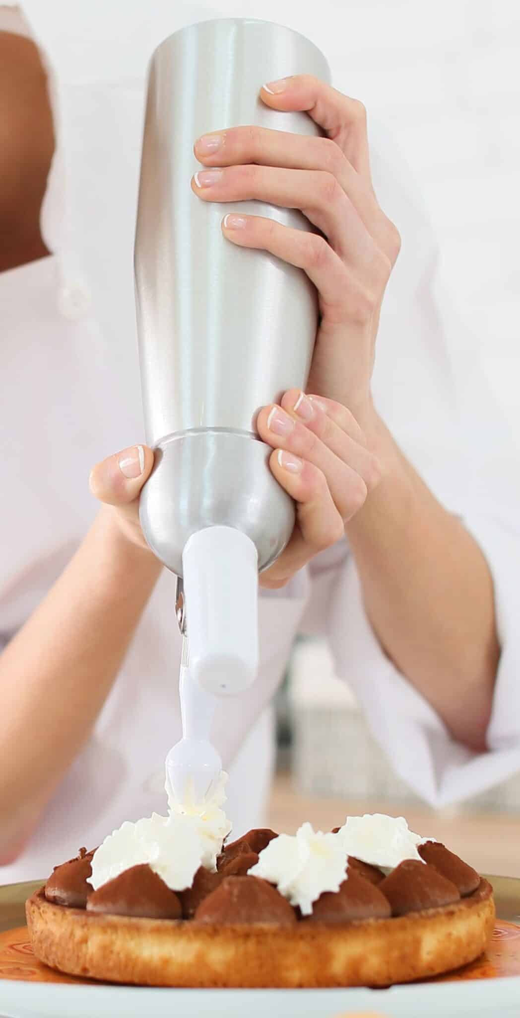 Når lattergaspatroner i dag bruges i køkkenerne til bl.a. at opskumme fløde med, så er det også, fordi gassen er meget opløselig i fedt. Så den fløde, der kommer ud af sifonen (se figur 31), indeholder meget gas, og når trykket falder udenfor gaspatronen, udvider lattergassen sig meget, og det giver en god opskumningseffekt af fløden.