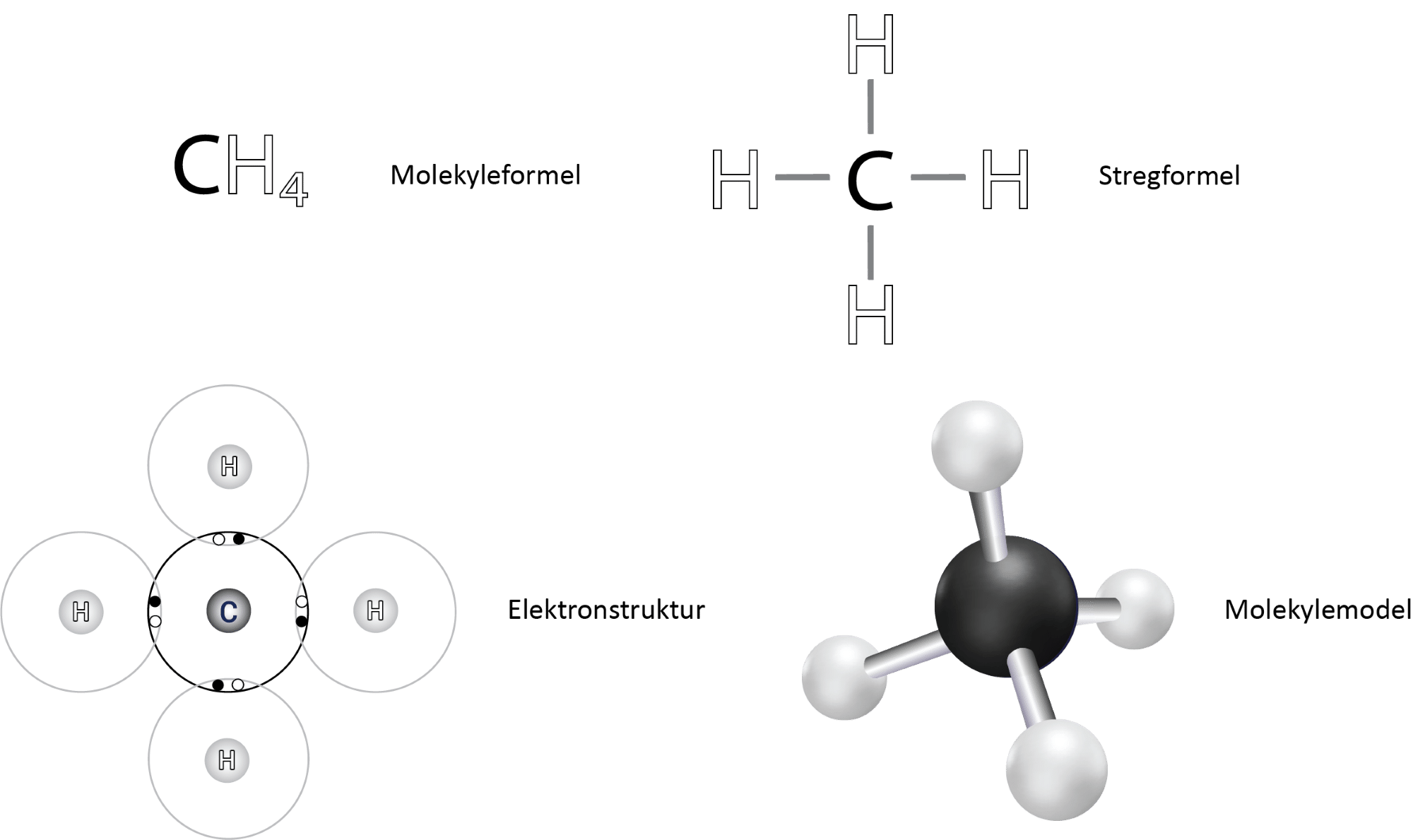Det centrale carbonatom har fire enkeltbindinger til hver af hydrogenatomerne. I figur 13 ses det i elektronprikformlen, at hvert hydrogenatom deler 2 elektroner med carbonatomet, og da der netop skal to elektroner til for at danne en binding, svarer det til en enkeltbinding.