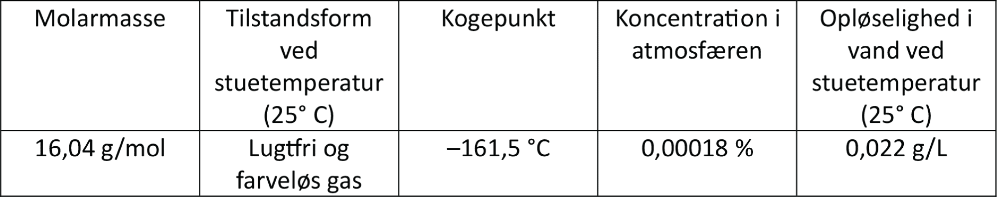 I figur 15 ses forskellige fysiske egenskaber for methan. Selvom molekylet er upolært, kan der opløses en smule af gassen i vand, men meget mindre end carbondioxid. Jo højere temperatur vandet har, jo mindre methan kan der opløses deri.