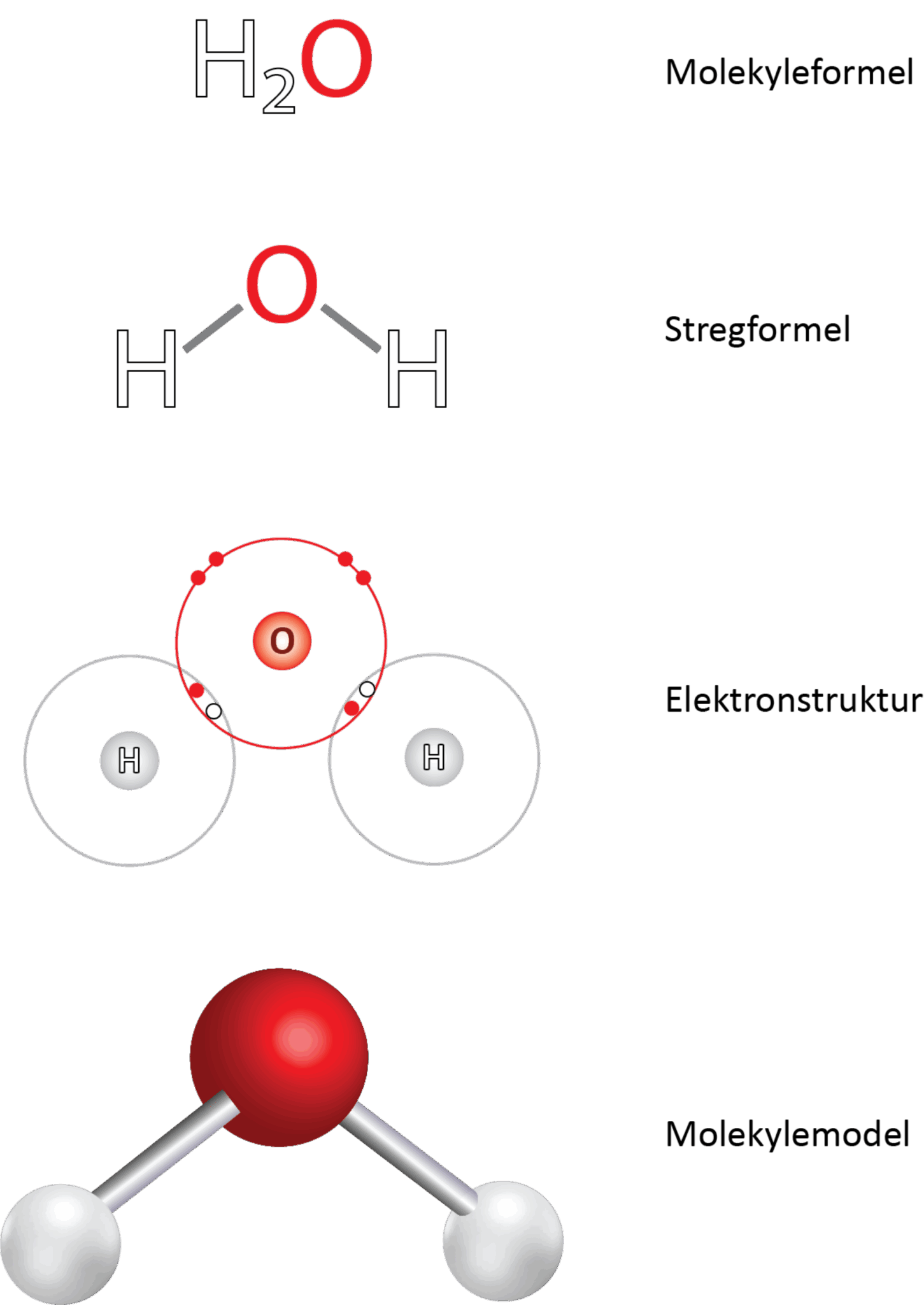 Det centrale oxygenatom har to enkeltbindinger til hver af hydrogenatomerne. I figur 17 ses det i elektronprikformlen, at hvert hydrogenatom deler 2 elektroner med oxygenatomet, og da der netop skal to elektroner til for at danne en binding, svarer det til en enkeltbinding.