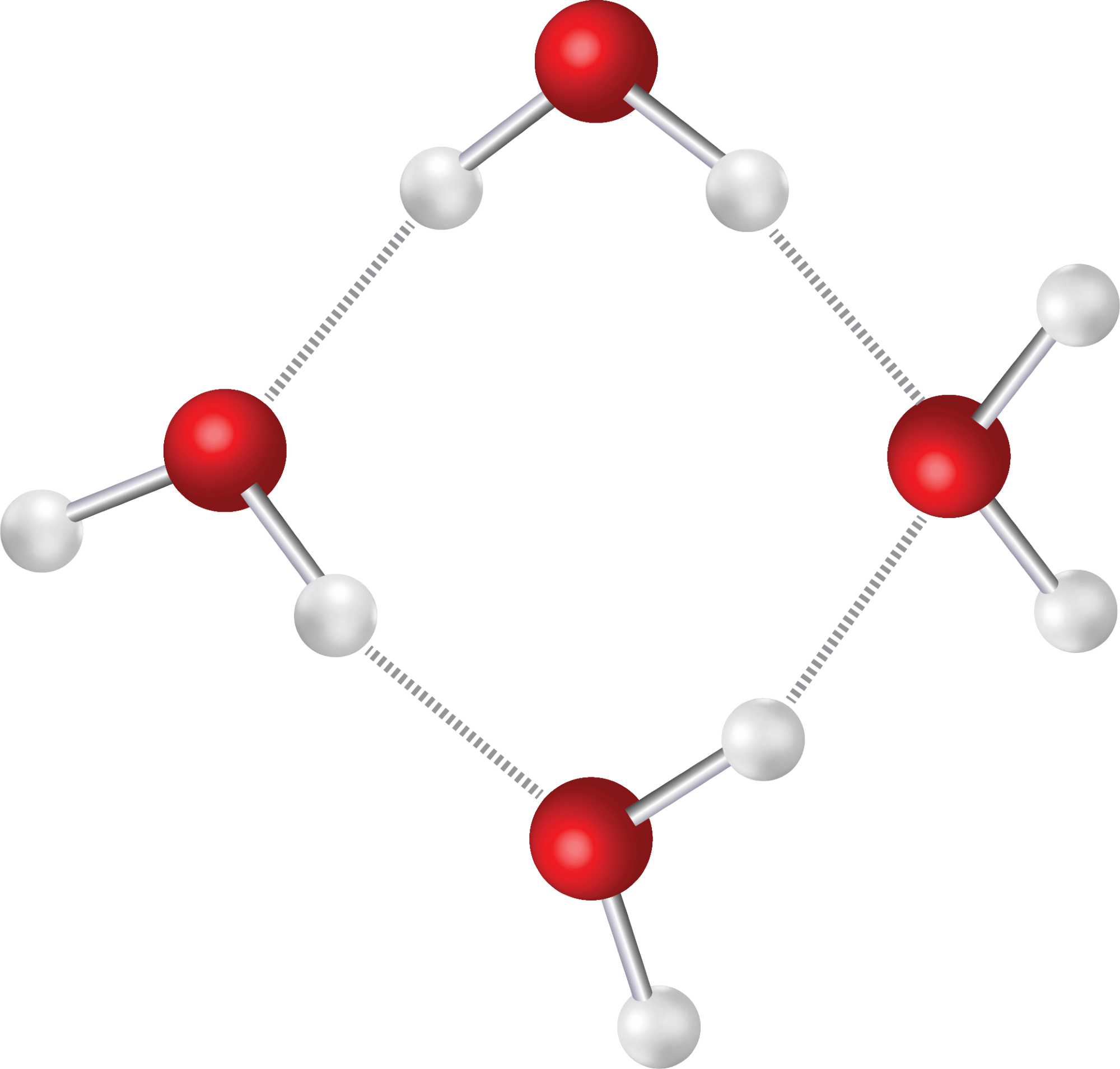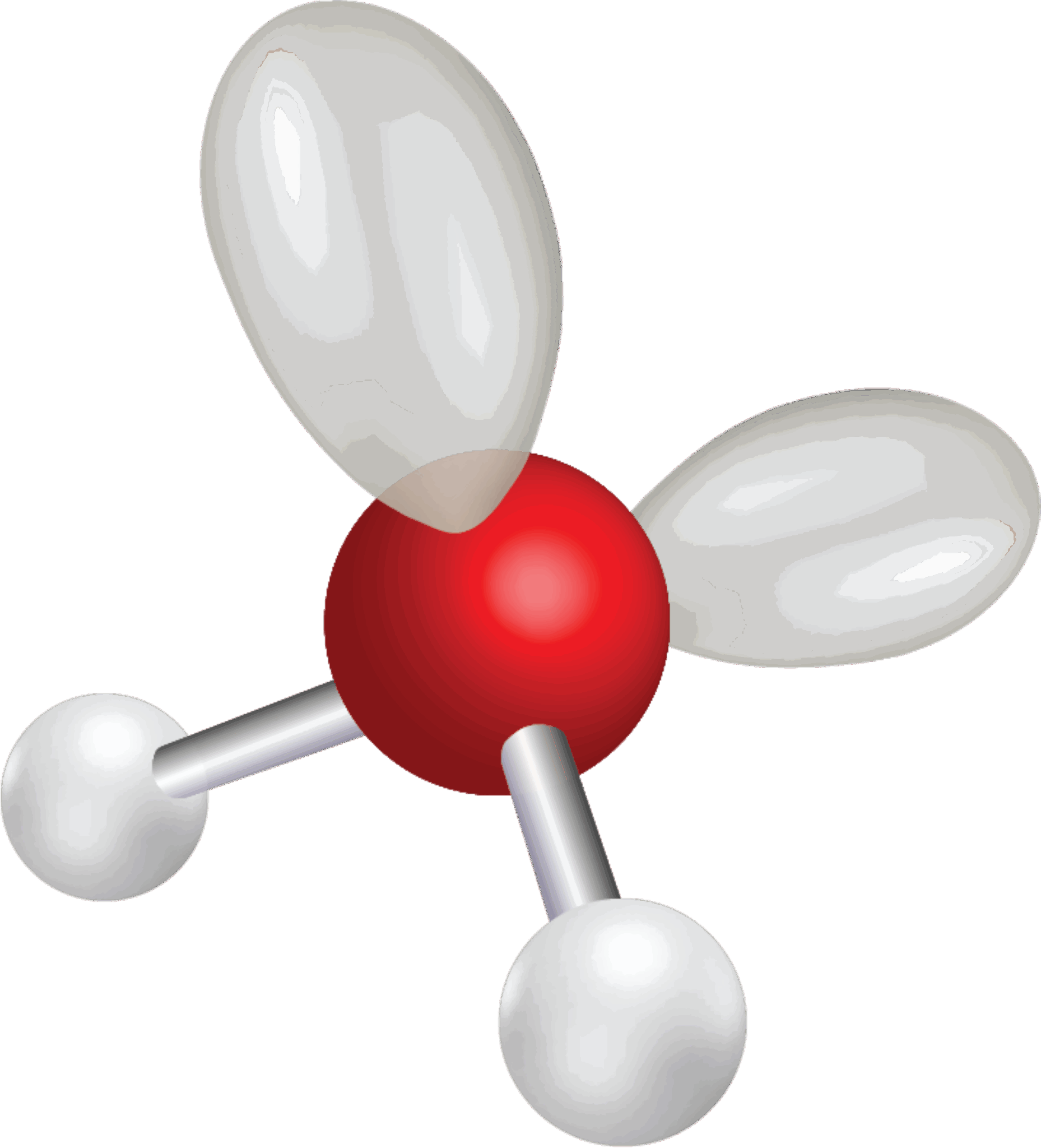 Bindingsvinklen mellem de to bindinger er 104,5°, så vandmolekylet er vinklet og ikke lineært, som man måske kunne tro. Hvis du har prøvet at bygge molekylet med et molekylebyggesæt, ser det ud til, at molekylet er plant. Et plant molekyle har nemlig alle atomer liggende i et plan. Men oxygenatomet har to frie elektronpar, som du kan se i elektronstrukturen i figur 17, og da elektronpar frastøder hinanden pga. den negative ladning, sidder de længst væk fra de to bindinger til hydrogen som muligt. Elektronskyerne (orbitalerne) for de frie elektronpar er overraskende store, som du kan se i figur 18, og de udgør 2 af de 4 hjørner i et tetraeder, mens de to hydrogenatomer udgør de to andre. Dermed er molekylets opbygning tetraederisk ligesom methan. De to frie elektronpar presser de to enkeltbindinger til hydrogenatomerne lidt tættere på hinanden, så bindingsvinklen bliver en anelse mindre end de 109,5° i methanmolekylet.