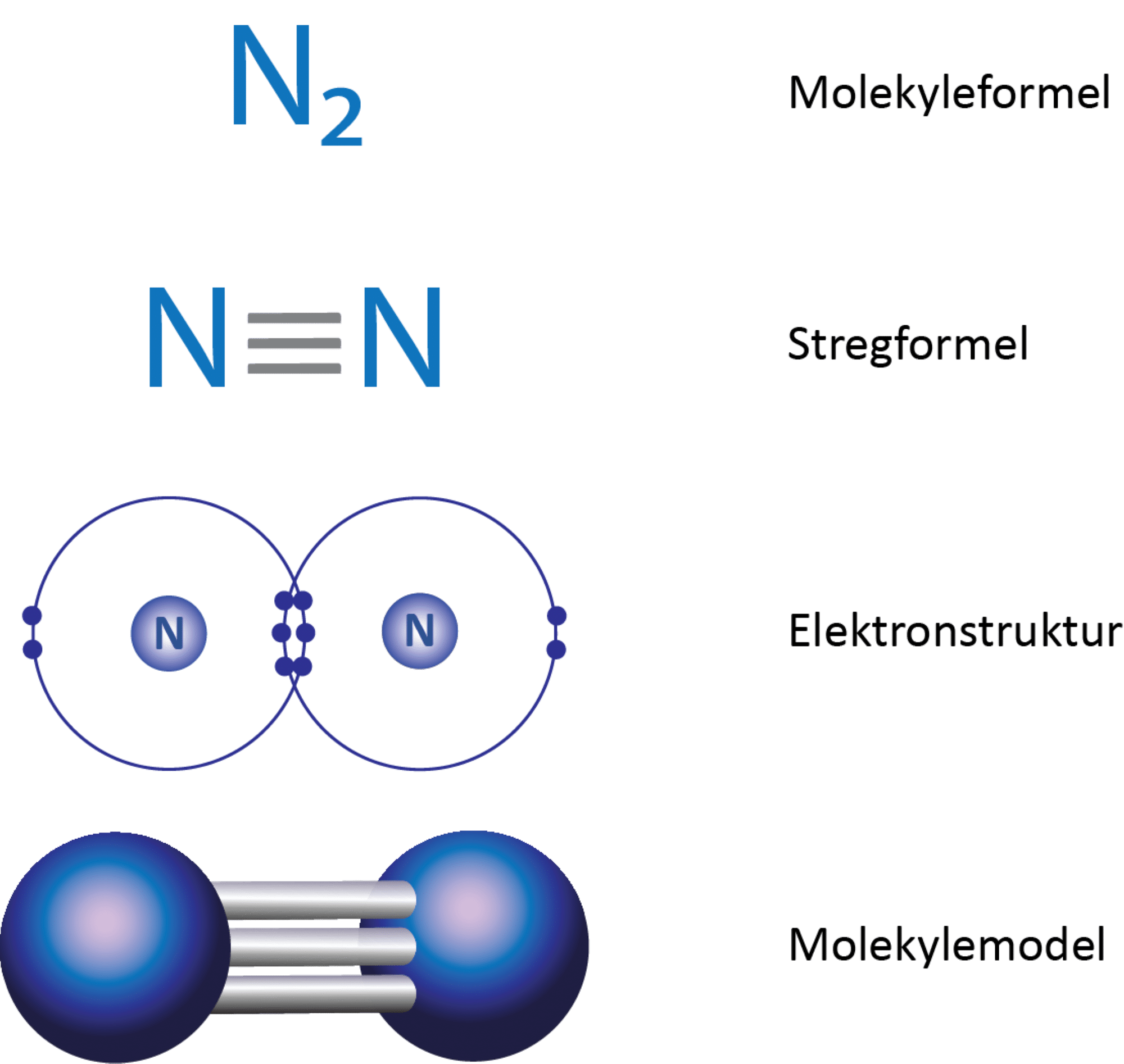 De to nitrogenatomer er bundet sammen med en trippelbinding. I figur 2 ses det i elektronprikformlen, at hvert nitrogenatom deler 6 elektroner med det andet nitrogenatom, og da der netop skal to elektroner til for at danne en binding, svarer det til en trippelbinding. Dermed opfyldes oktetreglen for begge atomer i molekylet.