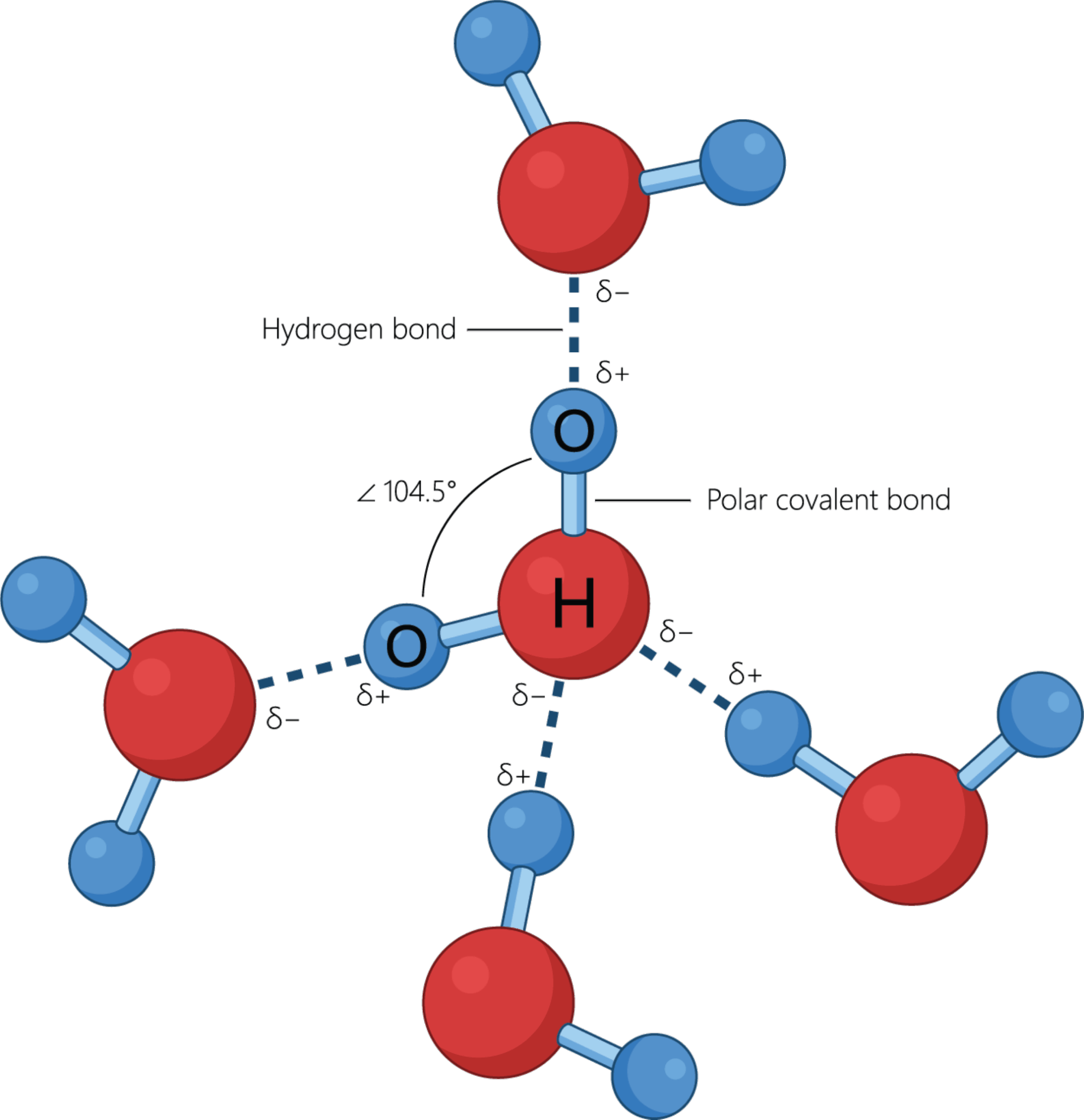 Bindingerne mellem oxygen og hydrogen er polære, da forskellen i elektronegativitet er over 0,5.