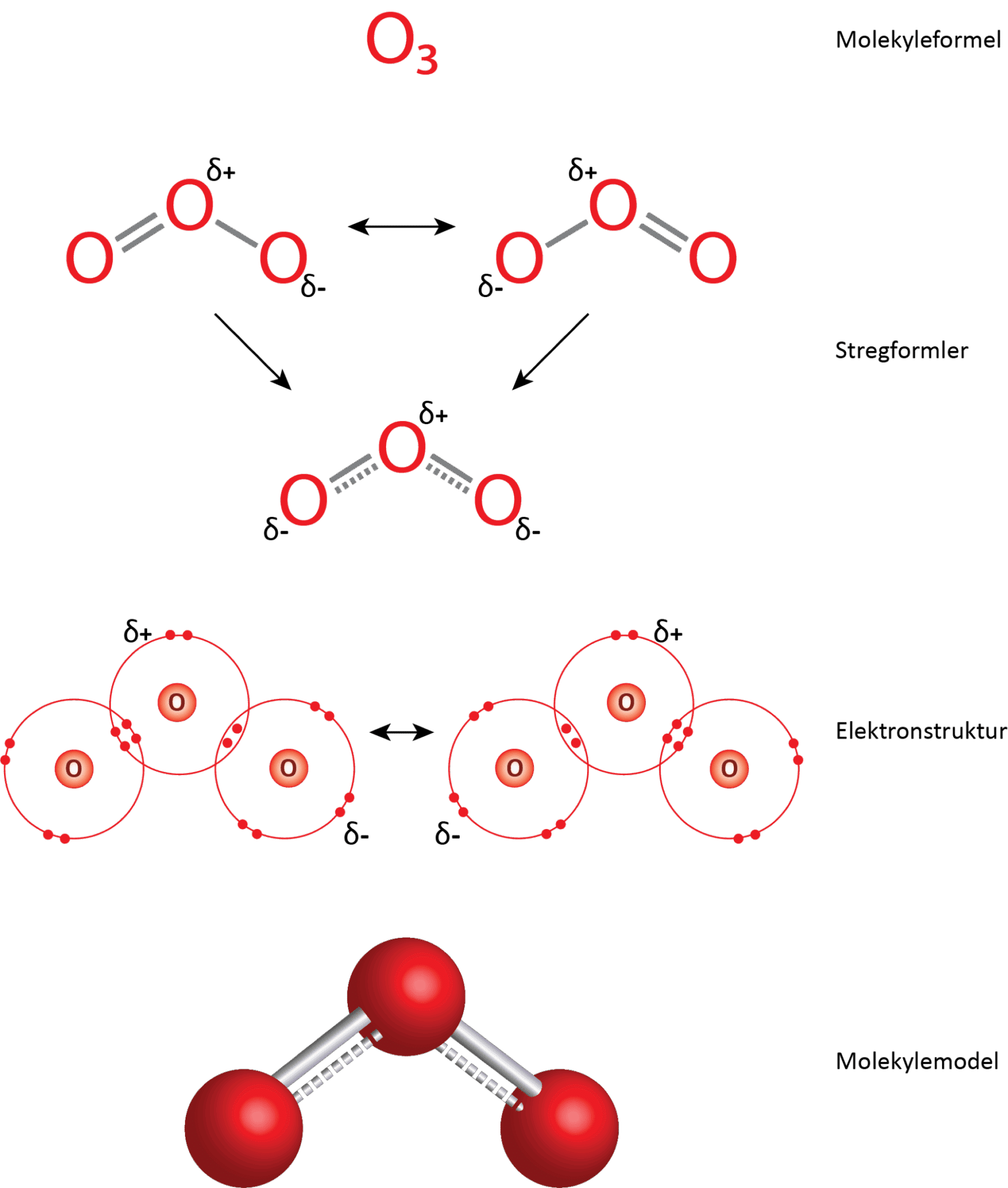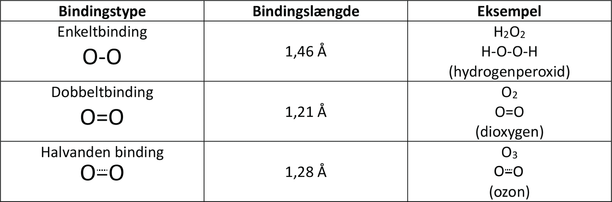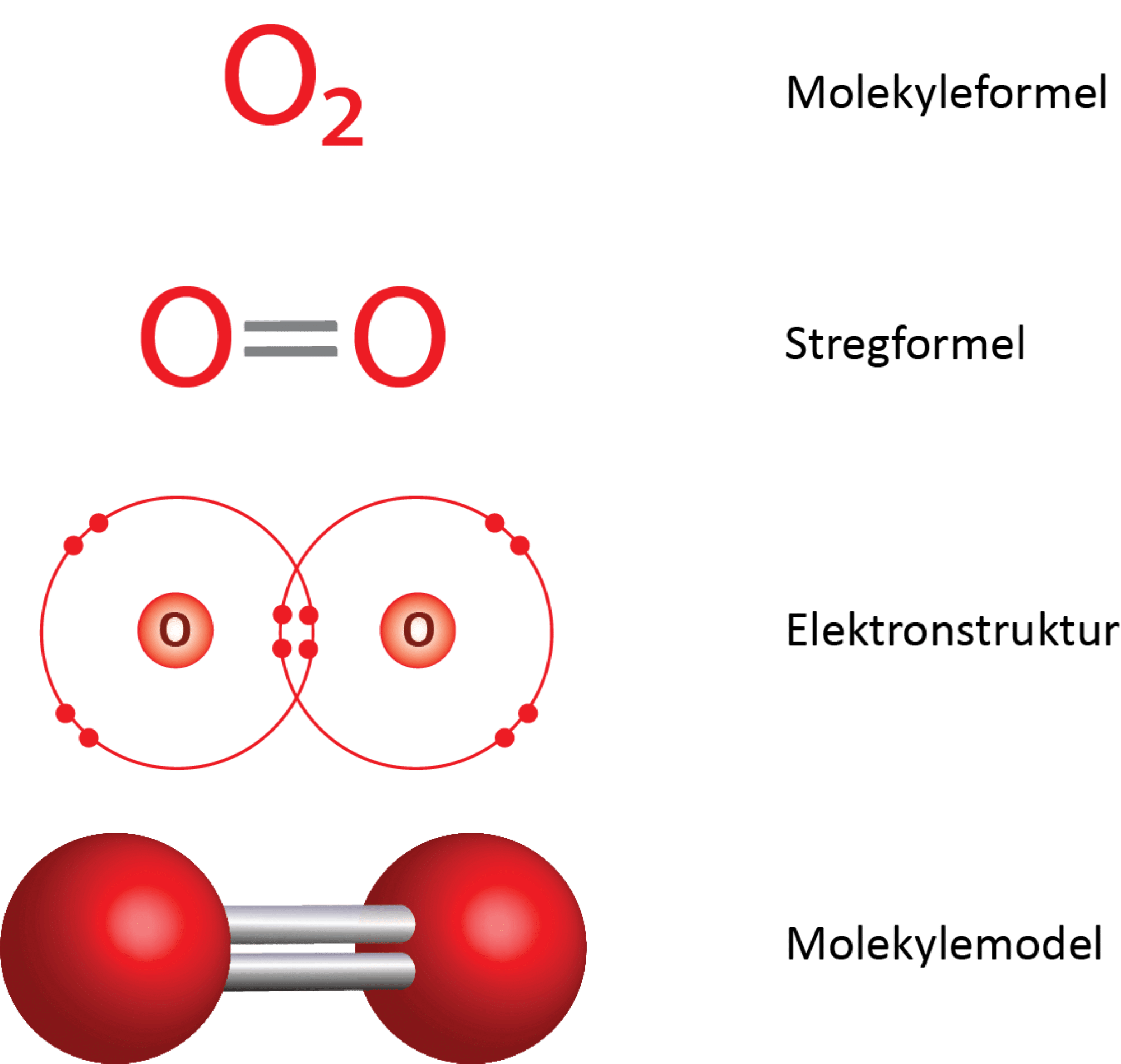 De to oxygenatomer er bundet sammen med en dobbeltbinding. I figur 5 ses det i elektronprikformlen, at hvert oxygenatom deler 4 elektroner med det andet oxygenatom, og da der skal to elektroner til for at danne en binding, svarer det netop til en dobbeltbinding. Dermed opfyldes oktetreglen for begge atomer i molekylet.