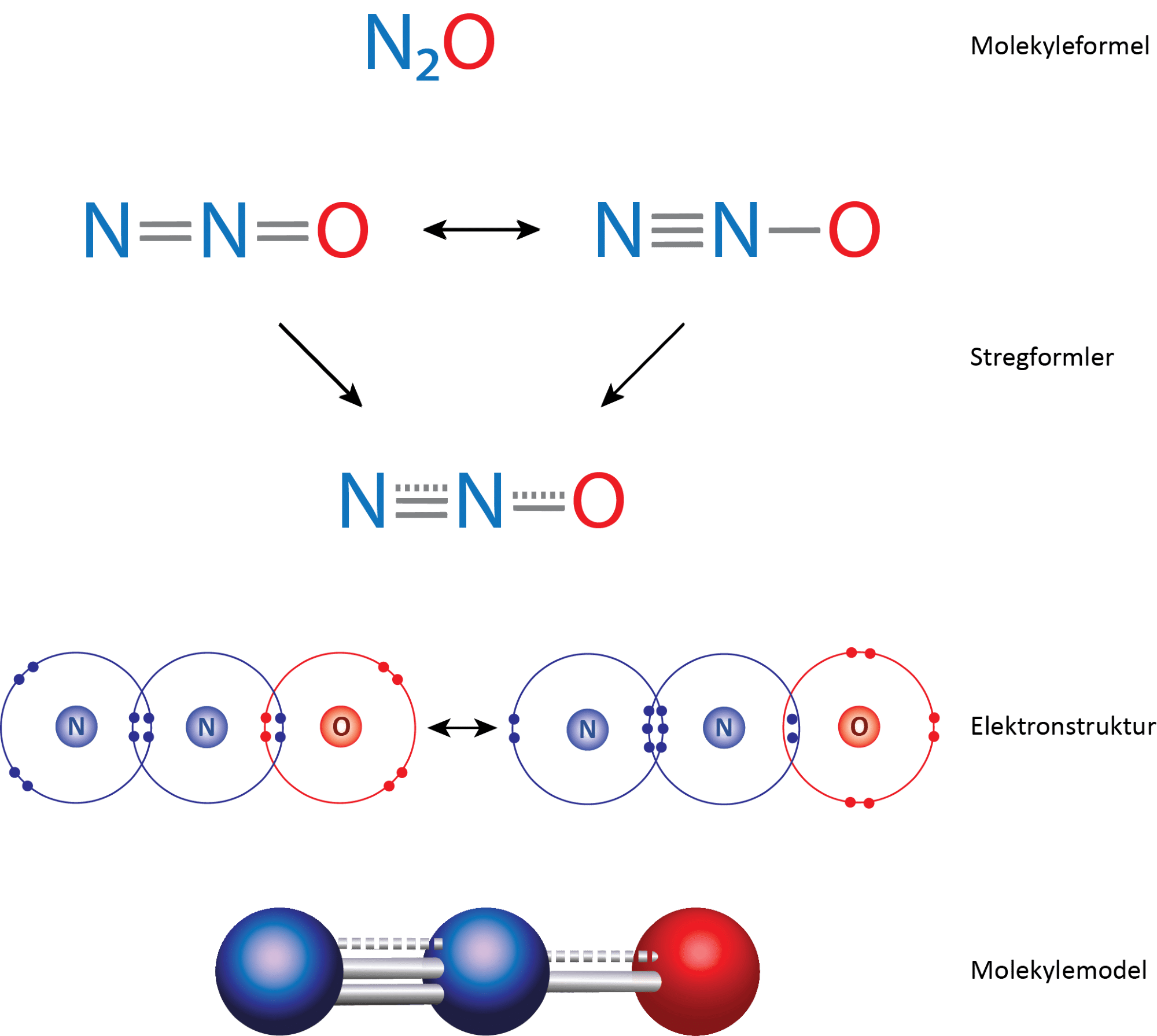 Dinitrogenoxid er et tretomigt molekyle, hvor alle atomerne er bundet sammen med flere bindinger end enkeltbindinger (2,5 og 1,5). Derfor er molekylet lineært.