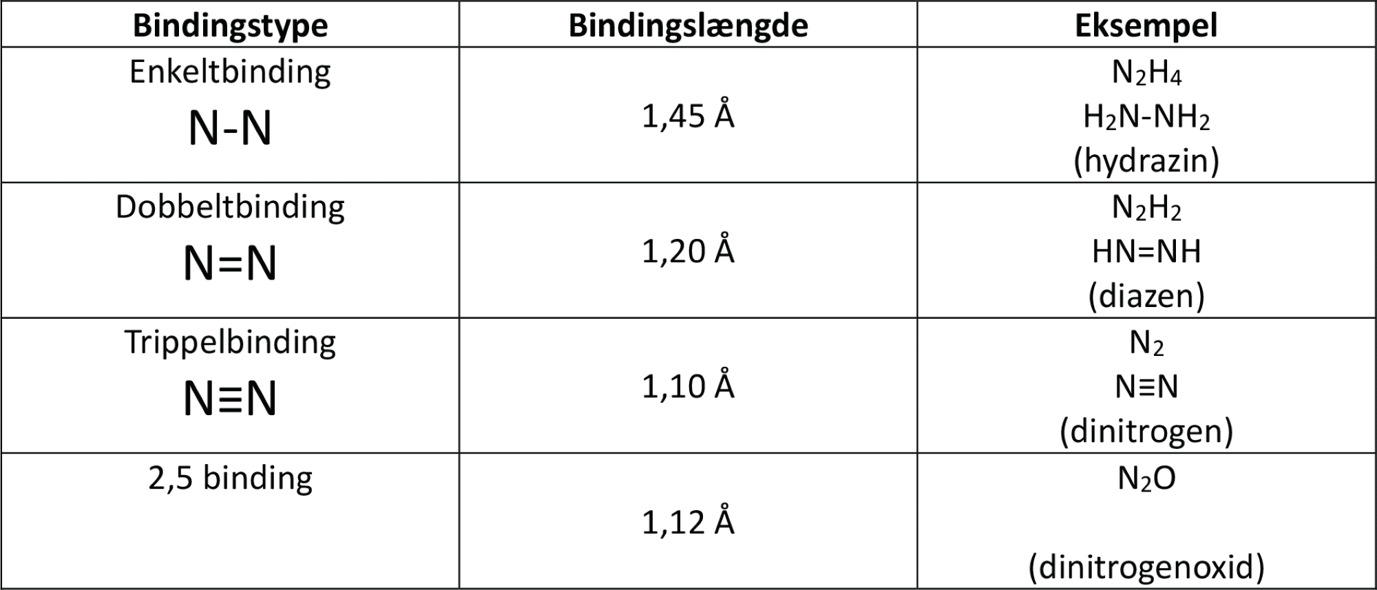 Ligesom du så for ozon, er længden af enkeltbindinger større end for dobbeltbindinger, der er større end trippelbindinger, og det gælder også for bindinger mellem nitrogenatomer, som du kan se i figur 28. Forskere har undersøgt bindingslængderne i dinitrogenoxidmolekylet og fundet ud af, at de er et sted midt imellem dobbelt- og trippelbindinger. De svarer til 2,5 binding.