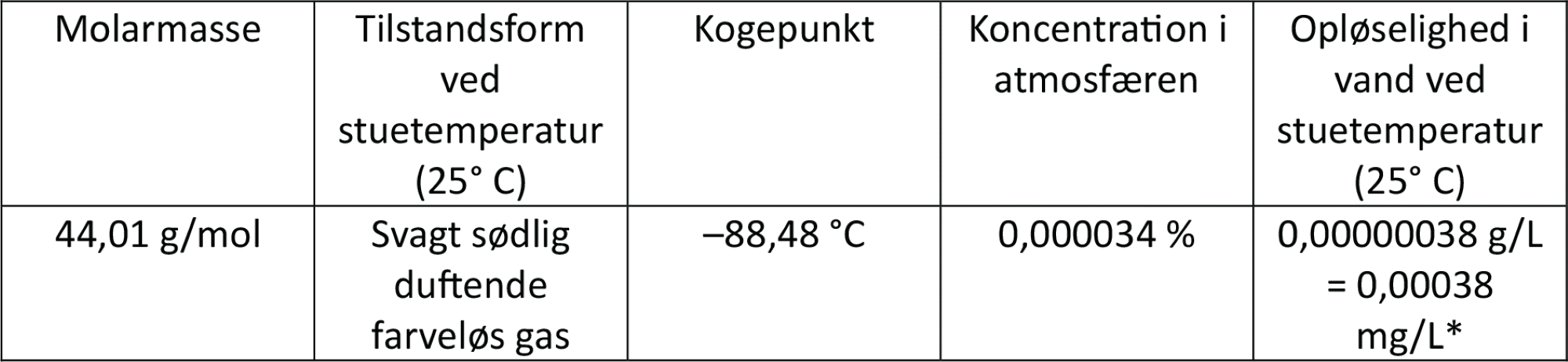 I figur 29 ses forskellige fysiske egenskaber for dinitrogenoxid. Selvom molekylet er på grænsen mellem polær og et upolær, opløses der ikke meget af gassen i vand ved stuetemperatur, når man tager udgangspunkt i den lave koncentration i atmosfæren. Jo højere temperatur vandet har, jo mindre dinitrogenoxid kan der opløses deri.