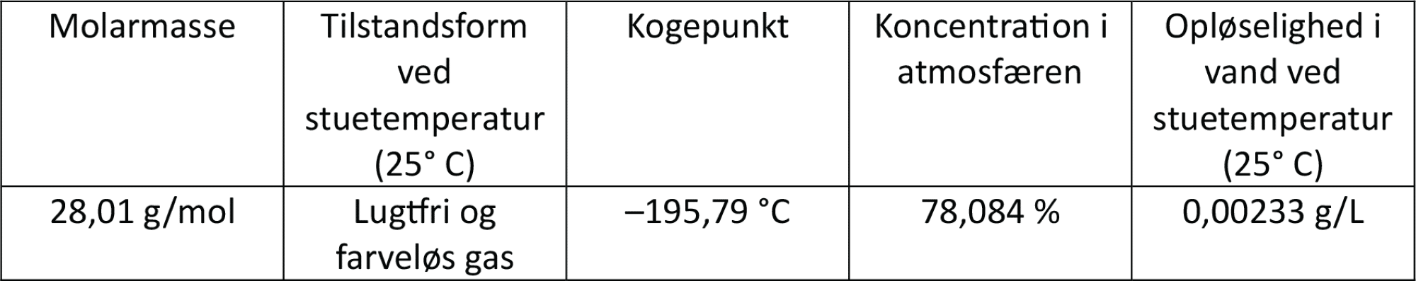 I figur 3 ses forskellige fysiske egenskaber for dinitrogen. Da molekylet er upolært, opløses der ikke meget af gassen i vand ved stuetemperatur. Jo højere temperatur vandet har, jo mindre dinitrogen kan der opløses deri.