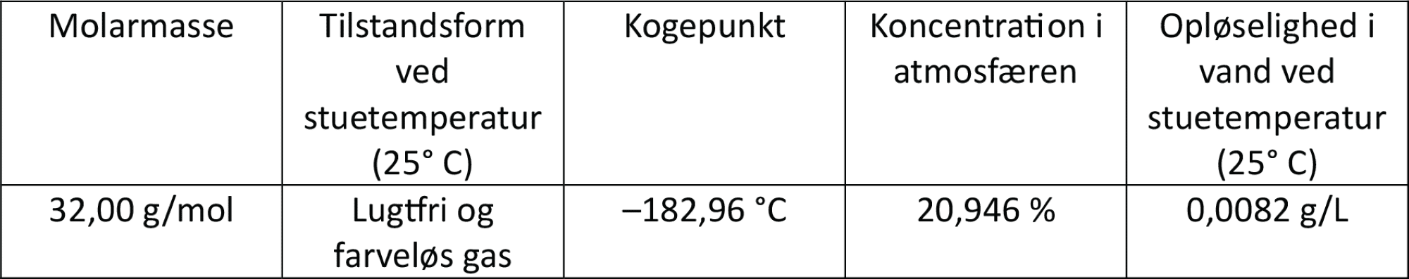 I figur 6 ses forskellige fysiske egenskaber for dioxygen. Selvom molekylet er upolært, opløses der tilstrækkeligt af gassen i rent vand ved stuetemperatur og normalt tryk til, at dioxygen-krævende organismer som dyr og planter kan leve i havet. Jo højere temperatur vandet har, jo mindre dioxygen kan der opløses deri.
