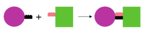 Kemisk kan man beskrive figur 2 lidt mere uddybende, som det er gjort i figur 3: De funktionelle grupper, alkynen (en carbon-carbon tripelbinding) og en funktionel gruppe du nok ikke kender, som hedder et azid (en funktionel gruppe, der udgøres af en lineær zwitter ion med tre nitrogenatomer: -N=N+=N−), gav ét produkt